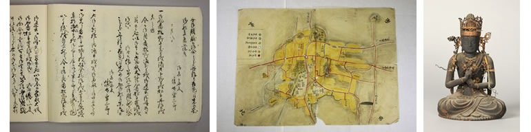 市史編さん室では、市史の編さんと刊行、歴史資料の収集・調査・研究・保存、市民の方がたへの普及活動を3つの柱と考えて、事業をすすめています。市史をつくるためには、地域に残る歴史資料や歴史的文化財の調査、研究が必要です。